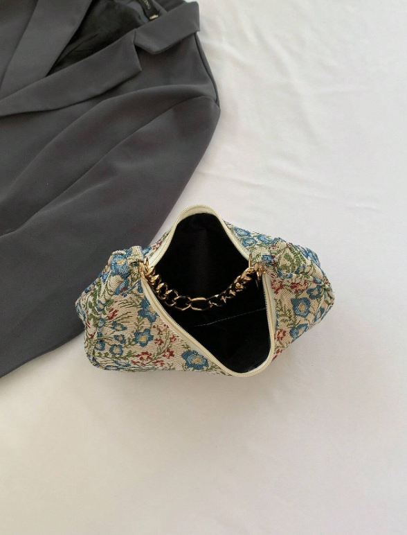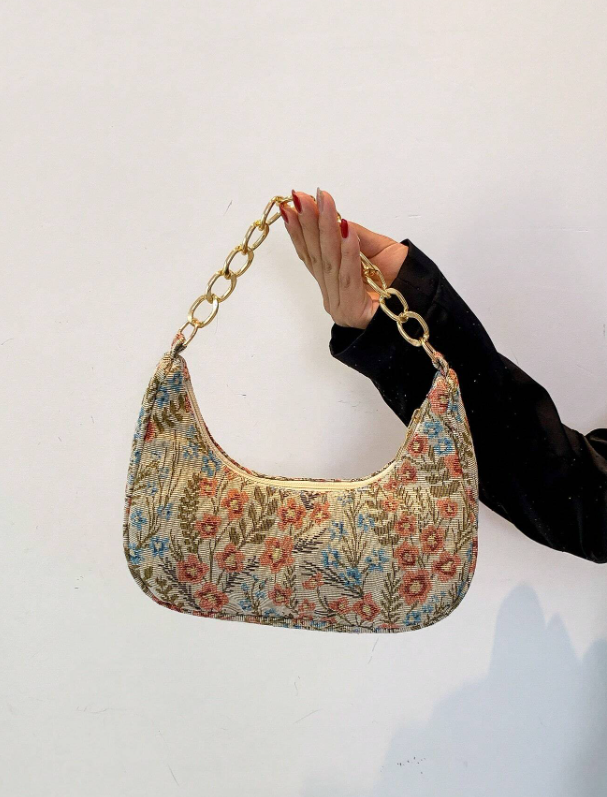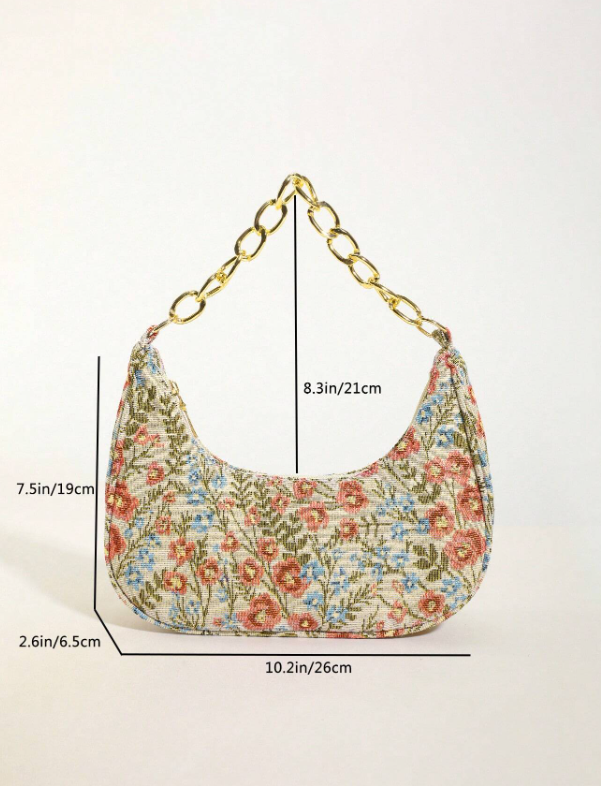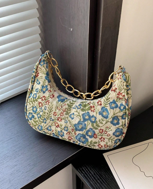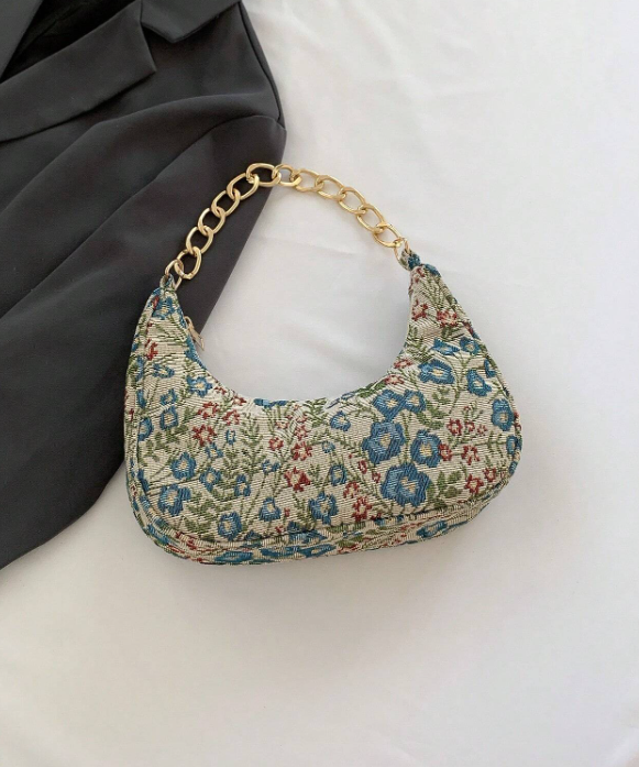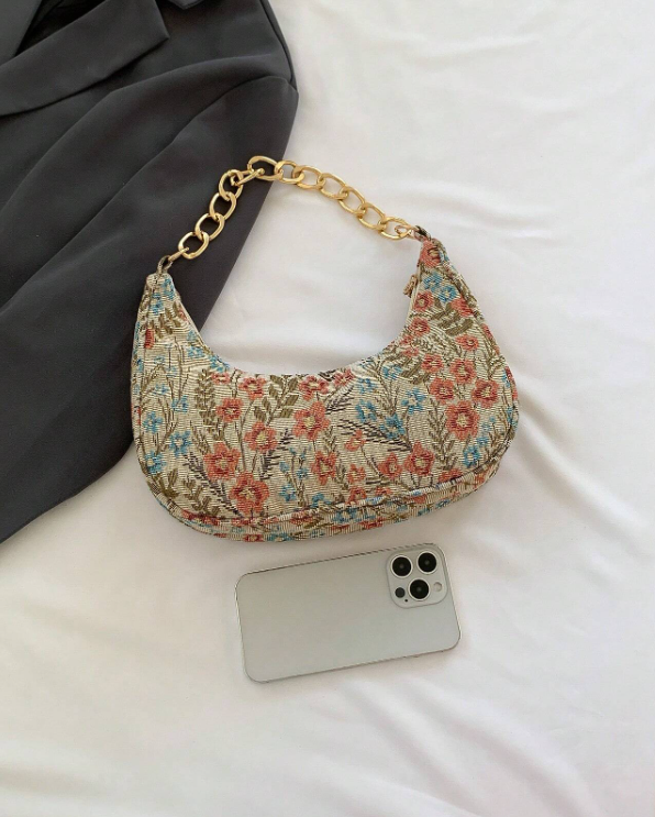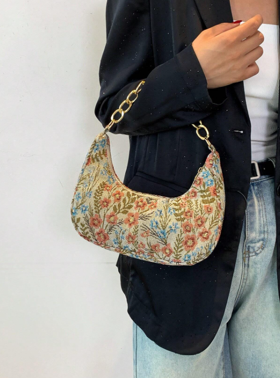 A beautiful crescent shape and vintage floral fabric prints for an embroidered look. Social outings and parties, great for pairing with solid simple dresses to add a spark of life into outfits.
