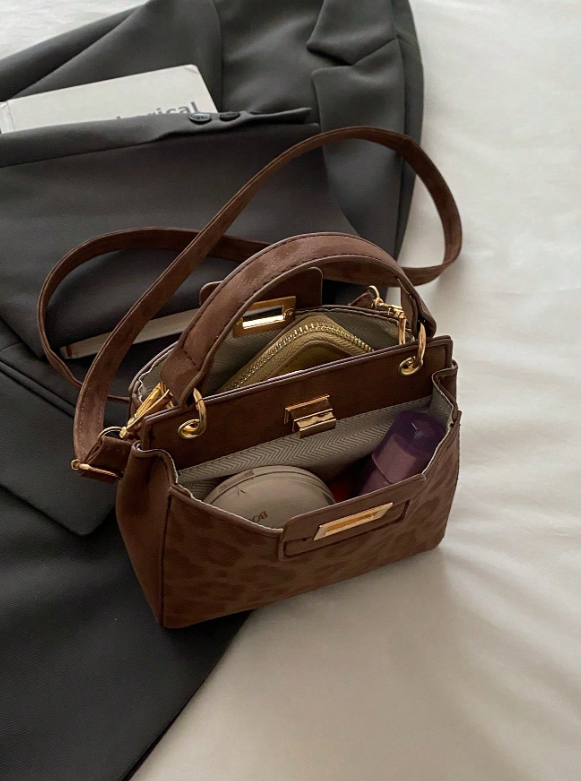 Crossbody shoulder strap and top handle, great for socials and classy fits. Smooth, wipeable texture. Darker colors carry subtle animal print.
