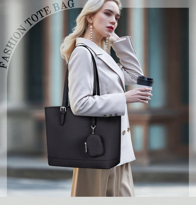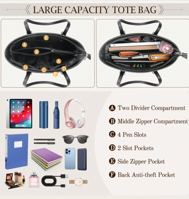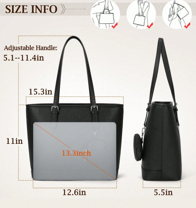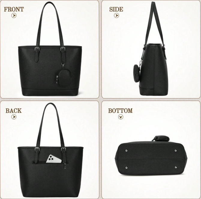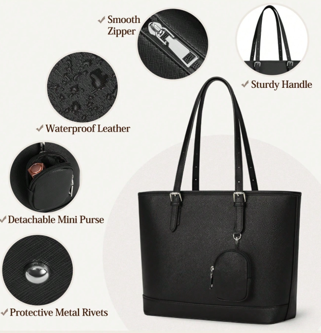 Large sized tote perfect for work, school or everyday carry in style. Its sophisticated minimal design boasts many features: purse, waterproof, protective base rivets and large carrying capacity.