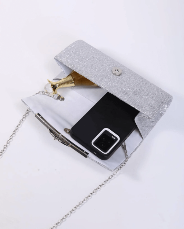 Mini sparkly glitter clutch bag with pleated metal edge, simple flip cover design for women to use in parties, weddings, dinner